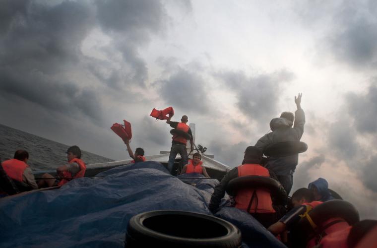 En serie dokumentära foton av Barat Ali Batoor följer människor på flykt från Afghanistan via båt till Australien. Människor stuvas under däck, eller väntar i ett skjul på fortsatt transport. En man på förvaret i Australien stirrar ut genom ett fönster.