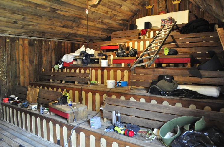 Fredrik Gunnarsson började tömma ladan som var full av bråte. Hans Volvo duett från 1965 (lika gammal som han själv) parkerades i trädgården. Med hjälp av några vänner har ladan fått en scen och ett 40-tal sittplatser i snidat trä med gulddetaljer. En kristallkrona hänger i taket.