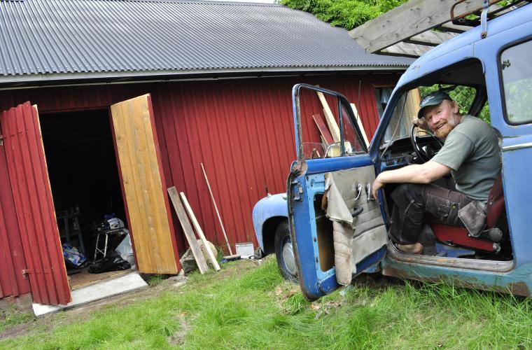 Trädgården är halvt belamrad med verktyg och bråte. Framför ingången till den röda ladan står ett gäng långa brädor lutade. De ska bli ett ljudisolerande staket som dämpar dånet från grannarnas gräsklippare. Och elen väntar fortfarande på att dras.