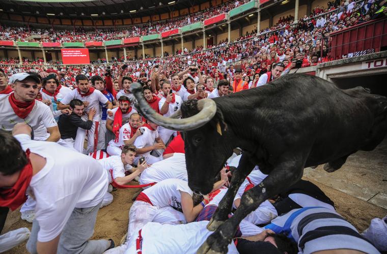 – Djuren halkar och knuffas fram på de trånga gatorna, jagade av hundratals, innan de slutligen kommer till tjurfäktningsarenan. Där inne retar och slår åtta tjurfäktare tjuren under kvart innan djuret slutligen dödas. Ofta drunknar tjuren i sitt eget blod då matadorens sikte är så inkorrekt att deras svärd går in i lungorna istället för hjärtat, säger Harriet Barclay vid Peta.