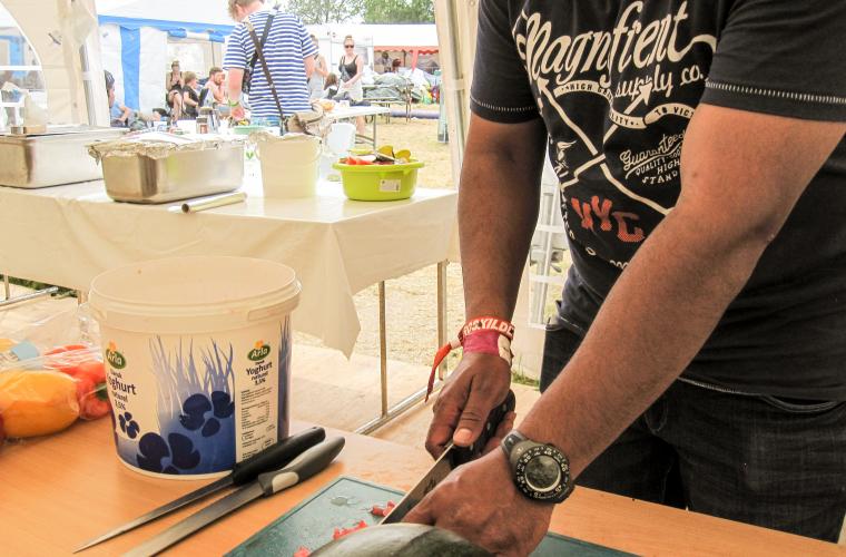 I scoutgruppen Skovejens Blå Spejderes kökstält står Mani och rör om i en av de stora grytorna som ska förse alla funktionärerna med mat.