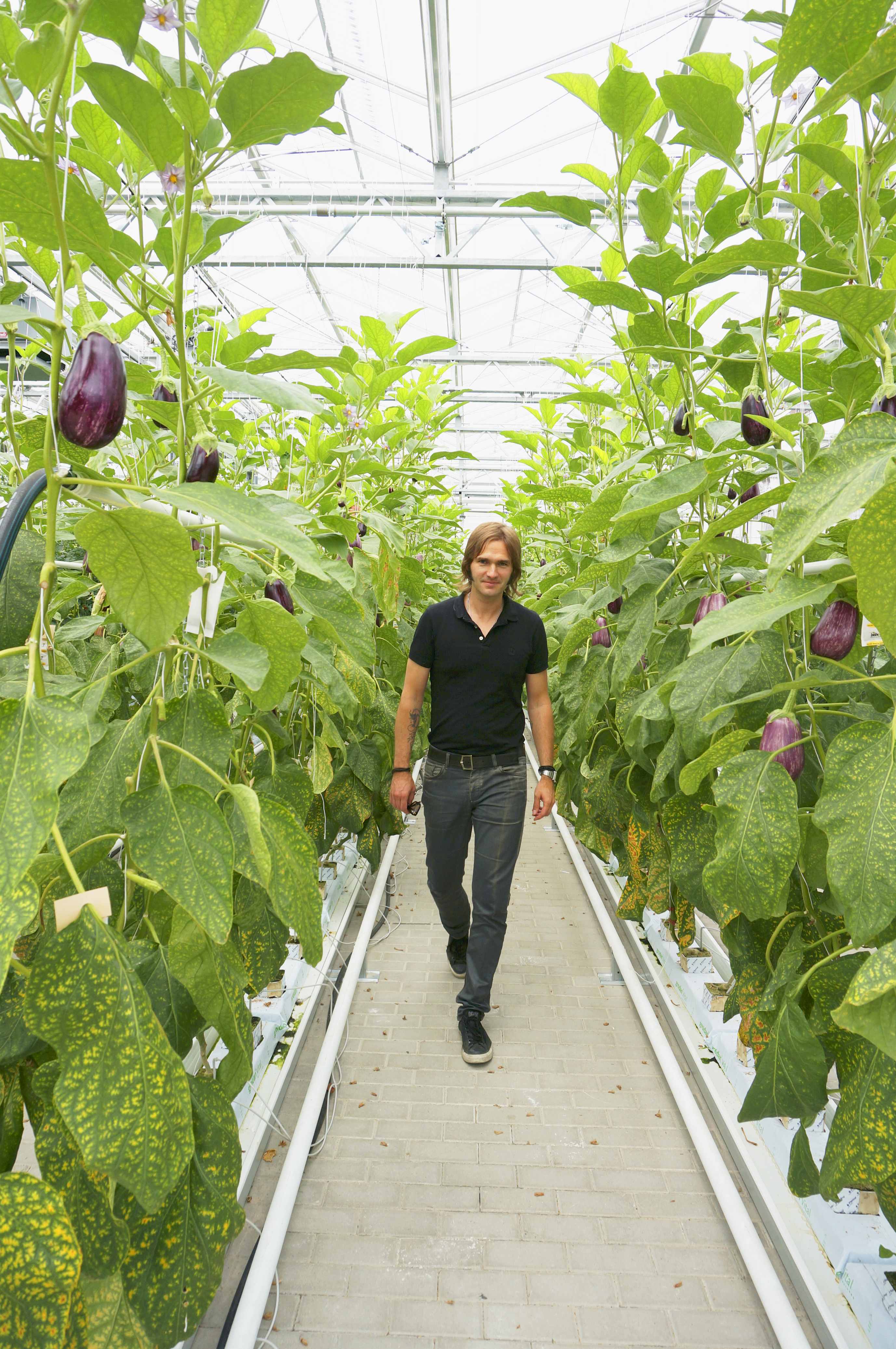 Med hjälp av bakterier omvandlas ammoniak från fiskens avföring till nitrat som blir näring åt växterna. Det näringsrika vattnet leds vidare in i växthusets uppemot 30-gradiga grönsaksavdelning, där det droppbevattnar långa rader av tomater och paprika. De står rotade i kuber av stenull, ett material som vanligtvis används som byggnadsisolering. Christian Echternacht poserar vant med en glänsande aubergine för kameran. Medieintresset har varit stort, och sedan farmen sålde sina första grönsaker i maj har de byggt upp en stadig kundkrets.