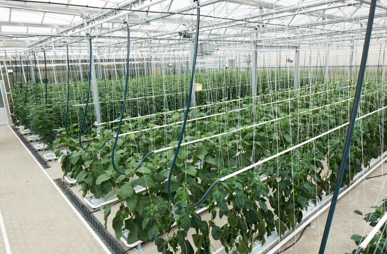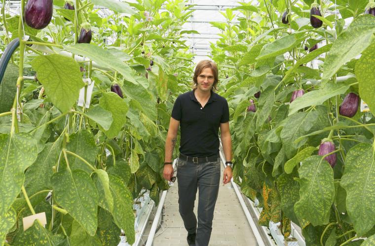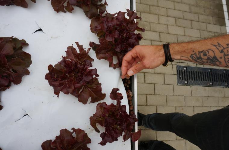 I en något svalare del av växthuset står vinröda salladshuvuden färdiga för skörd och mangold är på tillväxt. Plantorna, vars rötter står i lecakulor, sticker upp genom hål i ett stort vitt plasttäcke. Odlingsbäddarna översköljs ett par gånger per dag med ett ”ebb-och-flod-system”, som liksom vädringsfönster och skuggskärmar mot solen regleras automatiskt. Den planerade skörden är 35 ton grönsaker per år, och odlingssäsongen sträcker sig året om, säger Christian Echternacht.