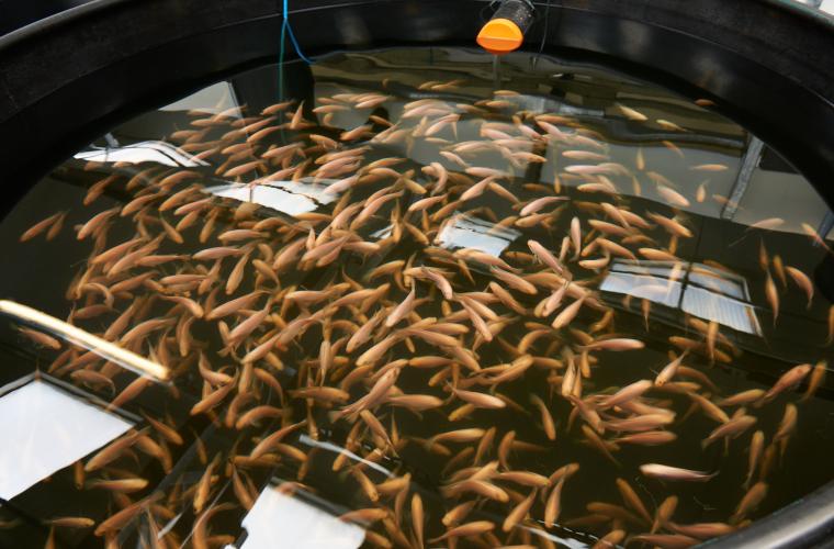 Regnvatten från byggnadens tak filtreras och värms till 27 grader för att passa fisken niltilapia, en art som odlades redan i antikens Egypten. Farmens planerade årsproduktion är 30 ton fisk. I oktober kommer tilapiorna vara stora nog att slaktas. Laxrosa simmar de omkring i 13 runda svarta plastkar, som besökare får betrakta genom en glasskiva.