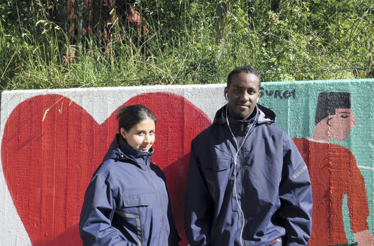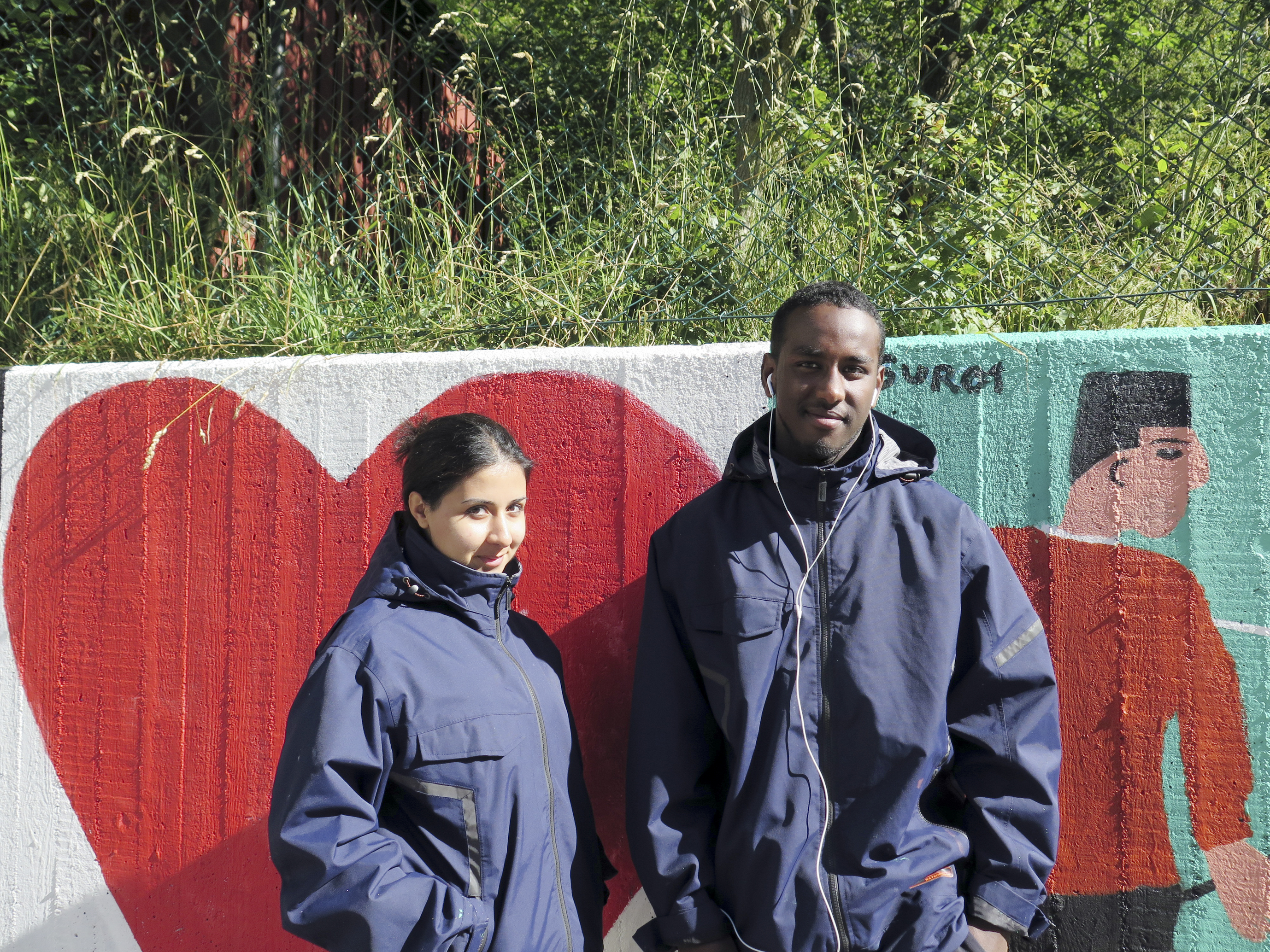 Ramadan är precis slut, och denna dag firas Eid al-Fitr, så bara tre av de sommarjobbande ungdomarna är på plats vid Hjällbo Lillgata. Annars brukar de vara runt åtta ungdomar mellan 16 och 19 år som under några sommarveckor var har fått som jobb att sätta färg på den grå betongen. Solen skiner men just nu är det ingen som målar, mycket av jobbet sker på andra platser än just framför väggen. Inne i den lilla lokalen håller Shilan Tahir och Derin Ismail på att skära ut mallar i papper som sedan ska målas upp.