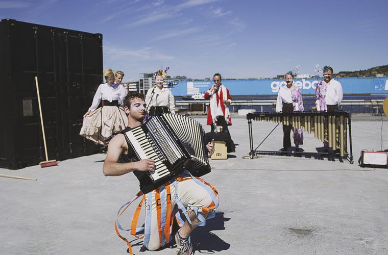 Två rytmiska gymnaster – eller kvastobater som de kallas – dansar, gör akrobatik och kastar med sina sopkvastar, två andra dansar såväl vals som jive, medan en jonglör kommer fram ur den stora gröna soptunna. Allt fler stannar till när de hör ljudet av slagverksinstrumentet marimba, gitarr, dragspel och Caroline Gustavssons sång sprida sig på Avenyn och överrösta ljudet från soundchecket på Götaplatsens scen som för tillfället pågår. Det är Cirkus Skrots första dag på Kulturkalaset, men familjeförställningen spelade de tidigare under sommaren på några utvalda platser runt om i stan.