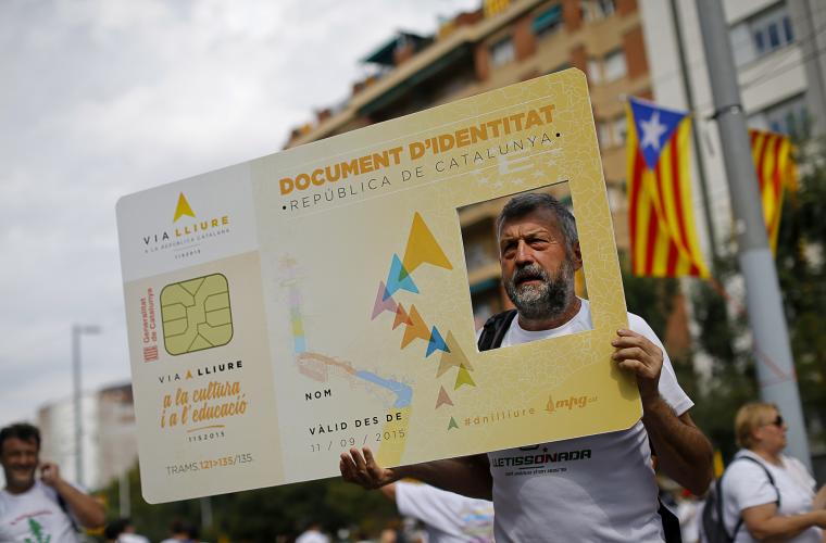 ”Leve Katalonien, leve! Självständighet, självständighet!” skanderar de uppemot två miljoner människor som samlats på Barcelonas gator den 11 september för ”den leende revolutionen”. Manifestationen sträcker sig över fem kilometer och varje sektion håller upp sina färgade papperstrianglar då den jättelika gula pilen far genom den gång som går genom folkmassan. Pilen som far fram går mot parlamentet där manifestationen tar slut.