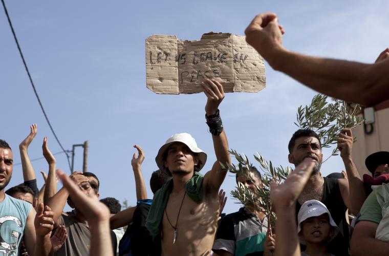 Längs gatorna på Lesbos hörs ropen skalla. Från det temporära flyktinglägret strax norr om hamnen kommer ett demonstrationståg.