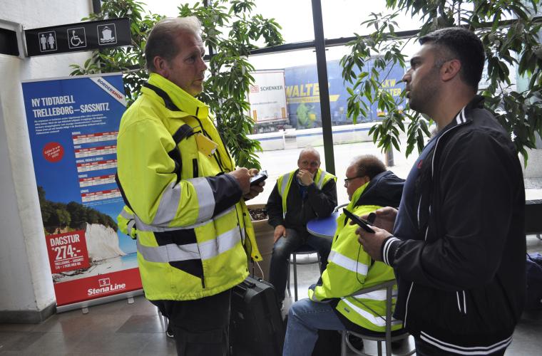 Snålblåsten viner över färjeläget i Trelleborgs hamn. Inne på passagerarterminalen sitter ett tiotal personer och väntar på färjan från Rostock.