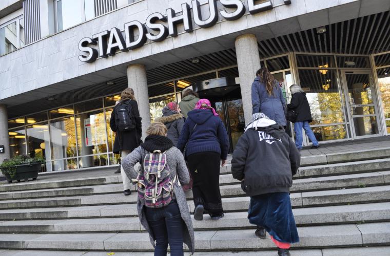 Så öppnar sig dörren från presskonferenssalen. Ut kommer Carina Nilsson (S), kommunalråd och ordförande i sociala resurs-nämnden. Hon går hastigt förbi gruppen med EU-medborgare som samlats. Men de boende vill prata med henne, med hjälp av en översättare.