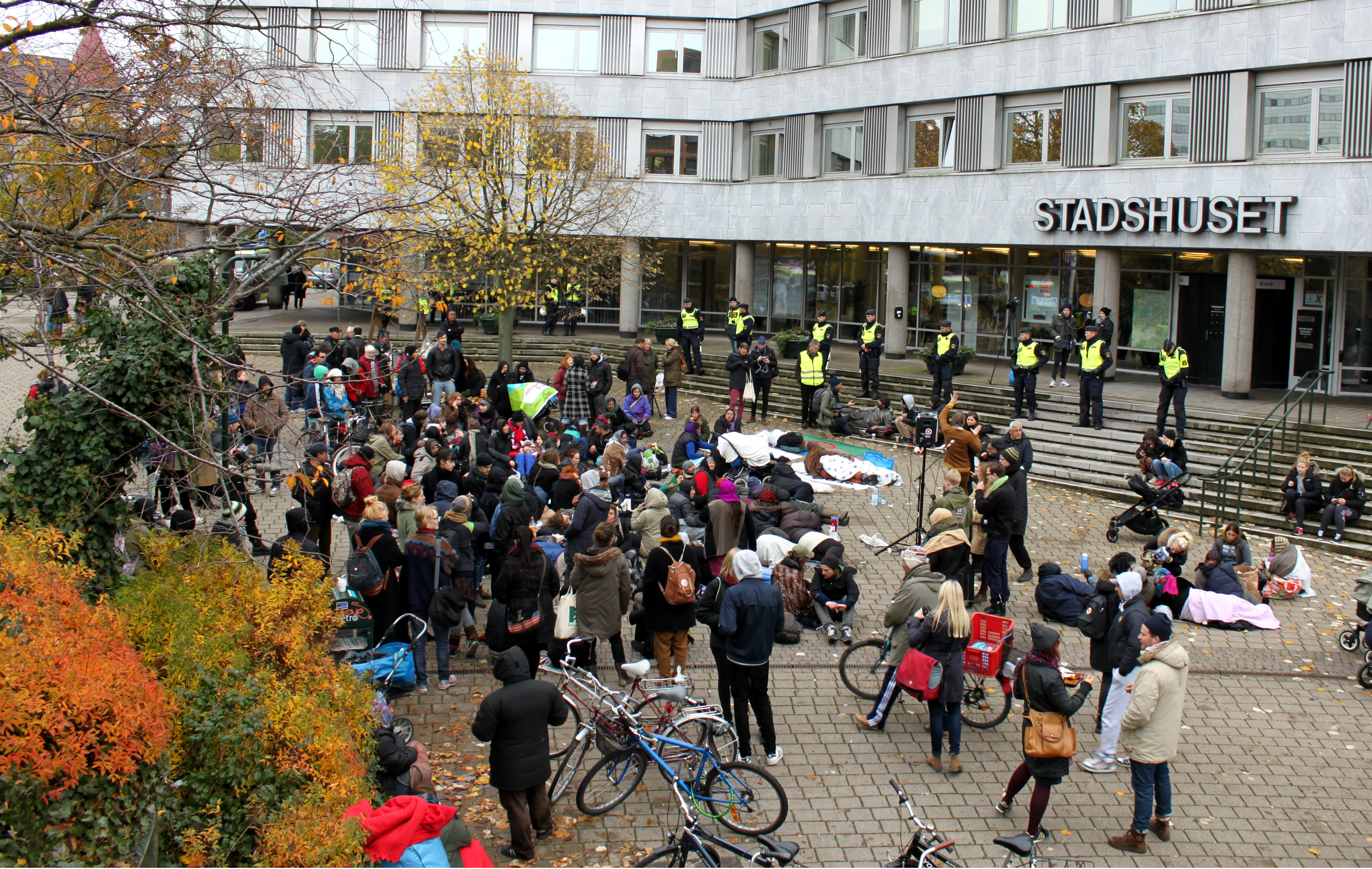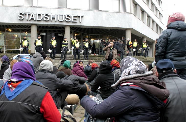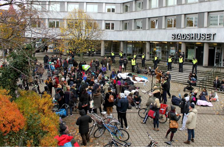 Efter att polisen kört ut alla boende från Sorgenfrilägret tågade gruppen till stadshuset. ”Avgå Carina” och ”Var ska vi bo”, skanderade demonstranterna.