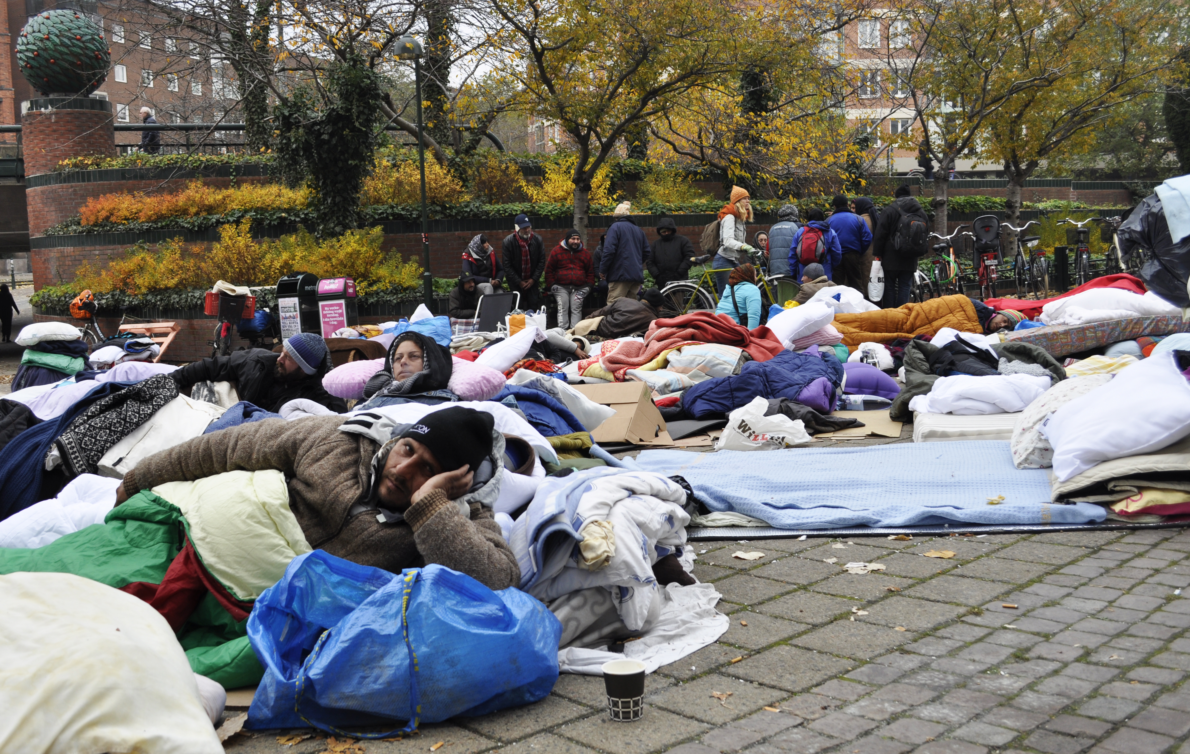 Människor försöker få en stunds vila på sina madrasser. Några värmer sig med kaffe ur plastmuggar. Det har varit en kall natt, berättar Christina, som sitter på stadshustrappan.