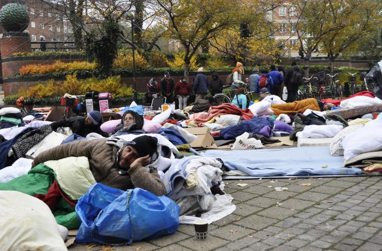 Natten mellan tisdag och onsdag sover 30-40 personer på marken utanför stadshuset i Malmö.