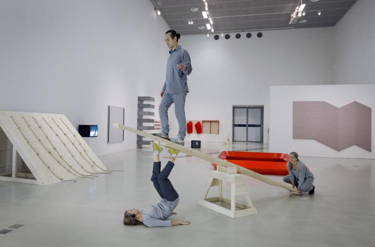Turbinhallen är jämnt upplyst, nästan helt tyst, och det enda som hindrar total överblick är en halvvägg som sticker vinkelrätt ut i rummet. Det är ljust och fräscht. Jag besöker utställningen sent en udda vardag och är i stort sett enda besökaren. Det betyder också att jag missar den mest konkreta beröringen mellan bildkonst och koreograf. Vid ett antal tillfällen uppförs Simone Fortis Dance constructions (1959) där dansare interagerar med olika objekt av Robert Morris.