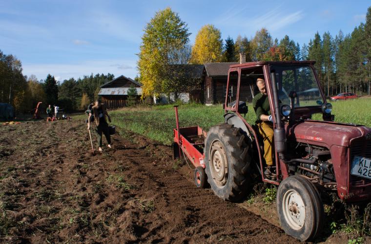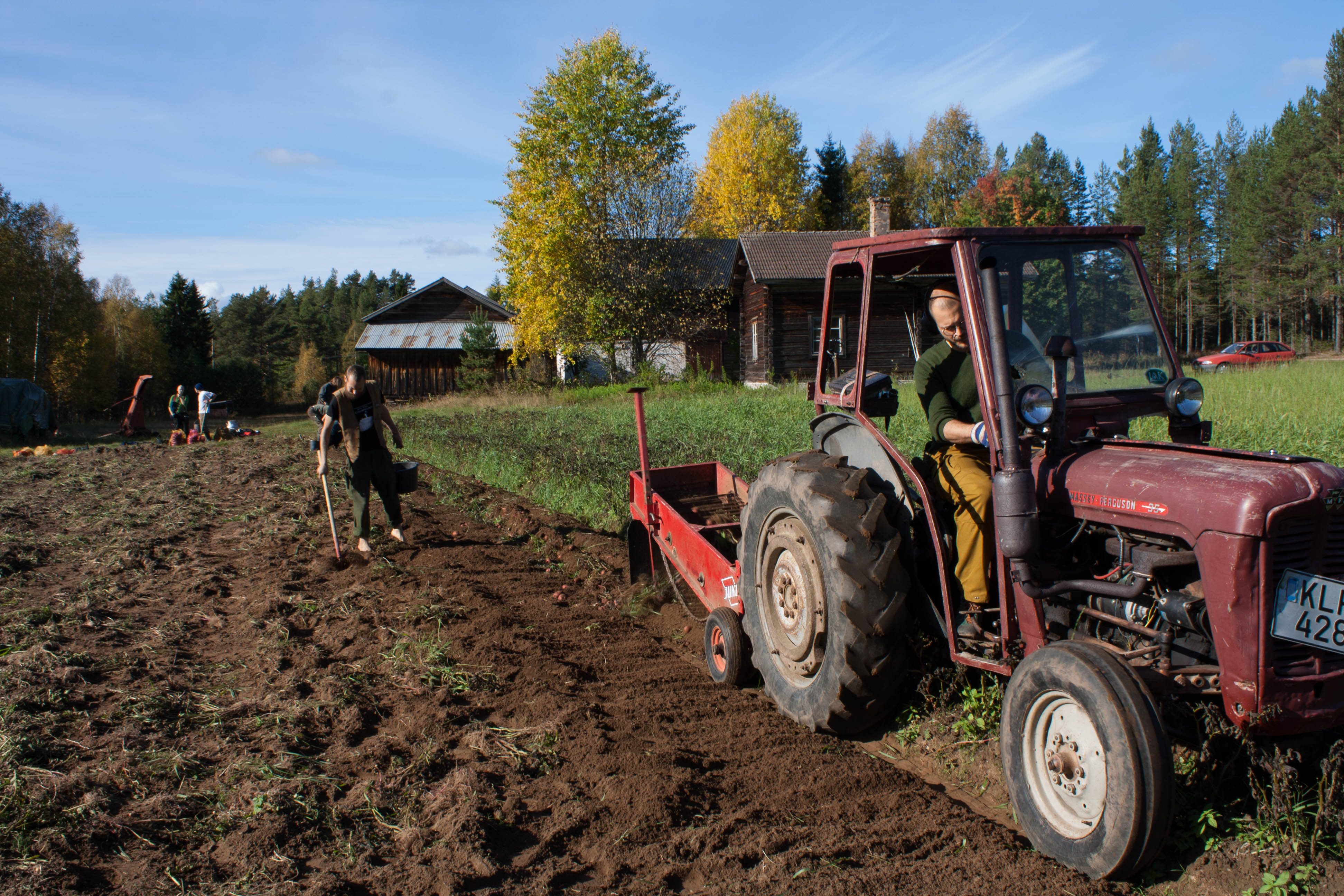 I traktorn sitter Filip Lejonberg och drar upp potatis medan Dennis och Julia Falk med flera plockar upp rotfrukterna från den mjuka myllan. I dag har gruppen fått hjälp av besökare från Bäckedals folkhögskola. Mycket ska upp innan kölden sätter in.