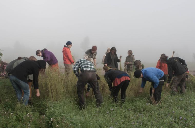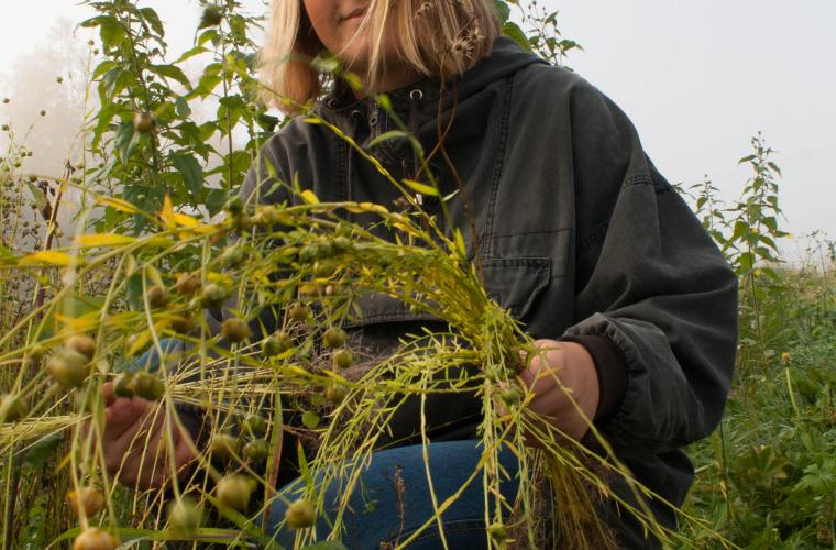 Tidigt nästa morgon är det dags att rycka lin som odlats nära grönsakslandet vid skolan uppe i byn. Sigrid är på plats när dimman övergår till ett behagligt solsken. Hon är aktiv fältbiolog och hörde om kursen genom vänner som gått den.