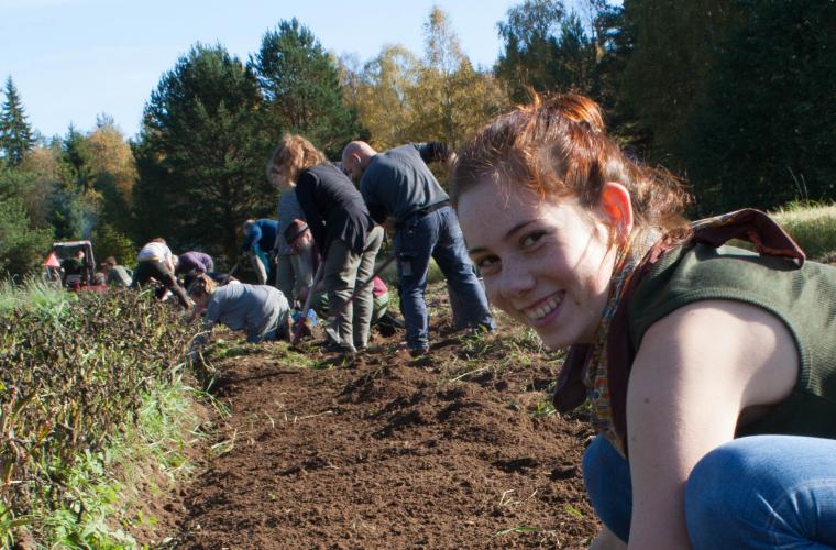 Dennis Lirbank och Sigrid Magnusdotter går kursen i dag. När vi ses är de i full gång med att skörda potatis, kål och lin som en del av kursens odling.