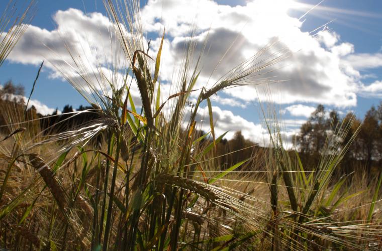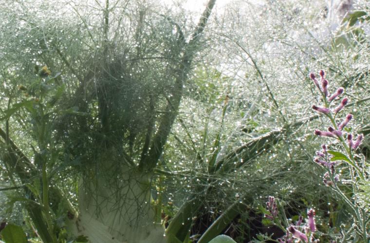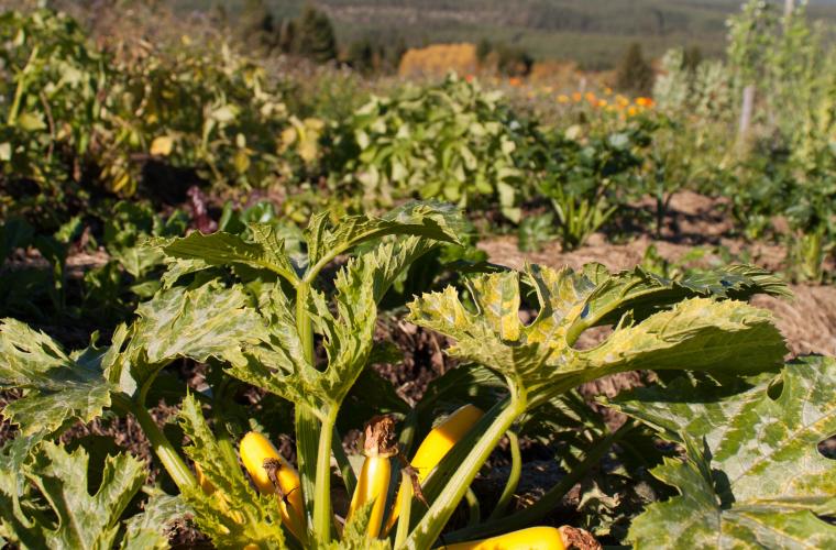 Han pekar på området där den lokala röda potatisen plockas upp och kornfältet vajar för vinden och förklarar att de odlar i fyrskifte. Längst till vänster odlar de kvävebindande växter, som exempelvis perserklöver och honungsört, som lagrar och binder kväve i jorden. Dessa används sedan som gröngödsel. Det fjärde skiftet, eller fältet, tas upp av olika sorters kål som grönkål, vitkål, rödkål, broccoli, röd och vit kålrabbi, brysselkål, majrova och fänkål. Allt roteras varje år.