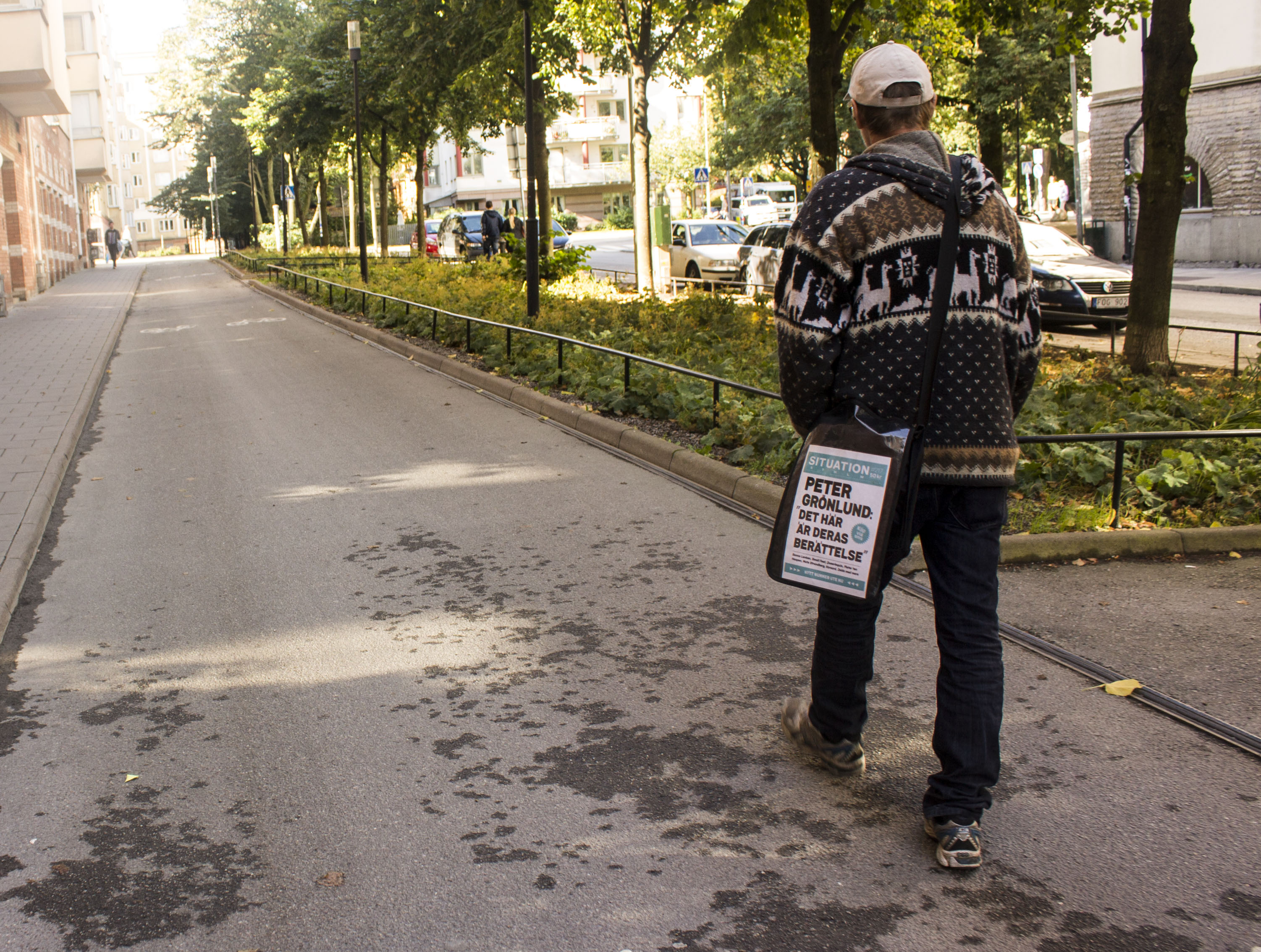 Klockan närmar sig 11. Pendlare rör sig ut och in från stationen, men det är förvånansvärt tyst. Trots höst i luften lyckas solen värma upp det lilla torget där mannen står. Han bär beige keps med loggan Situation Sthlm i gult. Glasögon, grått skägg och mustasch. En axelremsväska tynger ner hans högra axel. Över väskan hänger en liten löpsedel.