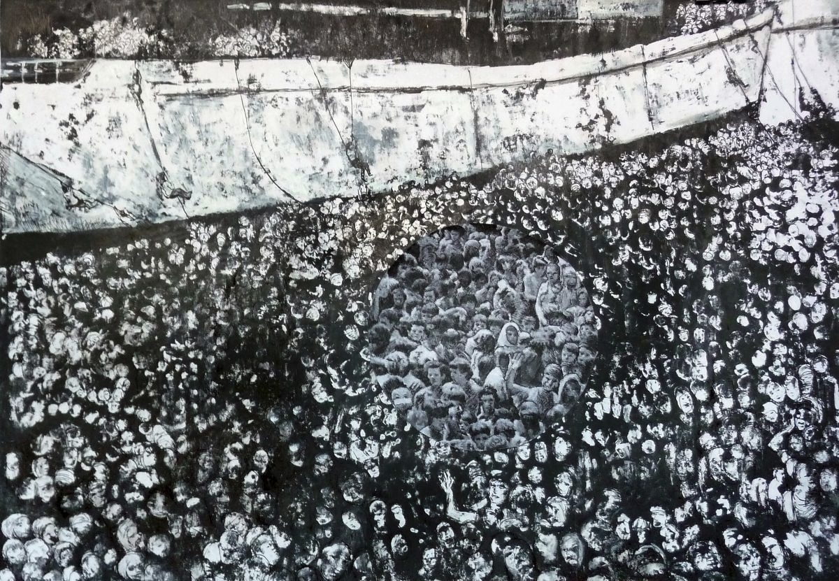 När man vant sig kan man konstatera att årets utställning rymmer mycket måleri. En rad influenser kan förstås skönjas, som till exempel Paul Klee, Lena Cronqvist (som suttit med i årets jury) och Rembrant. Här återfinns en stor blandning av stilar och format. I första rummet hänger Nick Alms enorma oljemålningar The Great implosion och Caféscen, som tillhör utställningens dyraste. Betydligt billigare och mindre i formatet är Harry Rozentals verk som jag fastnar för. Hans kolteckningar av gatuliv lyser upp genom färgklickar av olja som är sparsamt använda och står i kontrast till den mörka kritan.