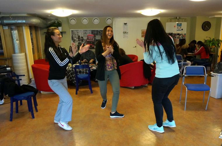 • Jasmin Al-Shaban och Nisrin Himdi spontandansar med en av Ungdomens hus anställda.