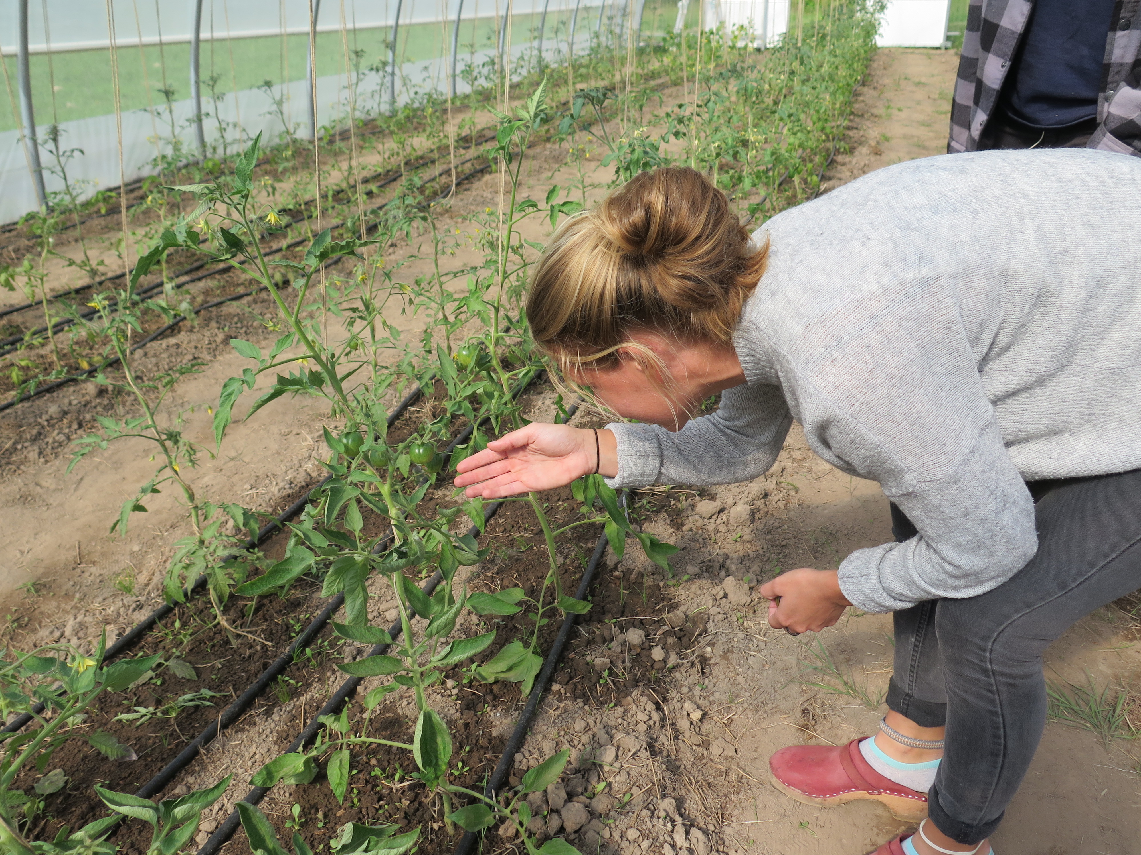 Längst bort från vägen på ägorna ligger den hektar mark som Charlotte och Jenny arrenderar av kommunen. Det är kvavt i det stora växthuset de själva byggde upp under ett antal intensiva dagar på senvåren. I långa rader står drygt halvmetershöga tomatplantor och gröna tomater hänger från grenarna.