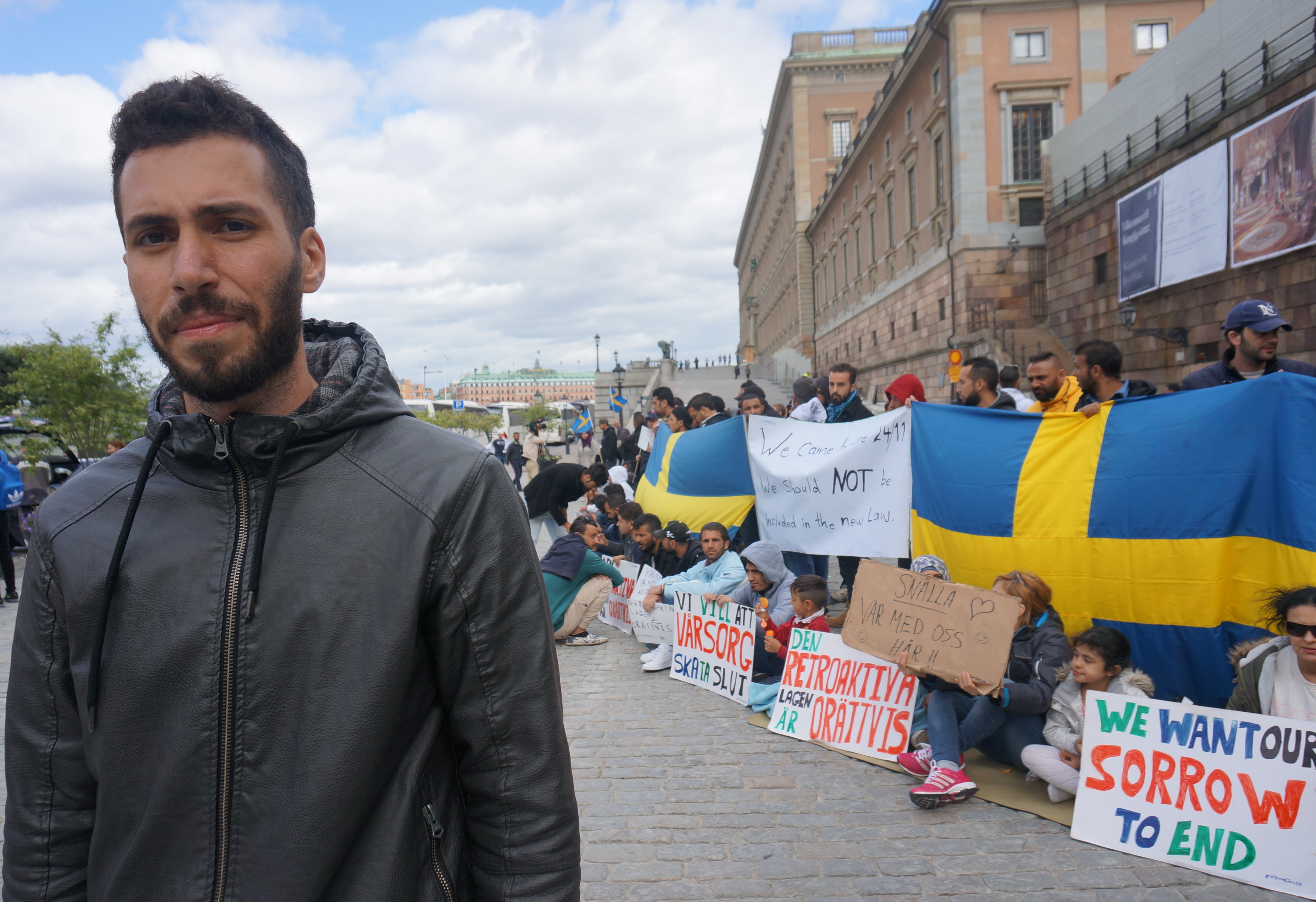 Ahmed kom till Sverige från Syrien i juli förra året. Han säger sig ha haft tur jämfört med många av de asylsökande som demonstrerar på Mynttorget, eftersom han sökte asyl före den 24 november 2015. Alternativt skyddsbehövande som sökt asyl efter det datumet har inte rätt till familjeåterförening enligt den nya lagen – trots att den röstades igenom först 21 juli i år.