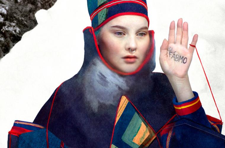 Kvinnan i den samiska dräkten blickar ner på oss från affischer överallt när vi passerar genom ett regnvått Kiruna. Den vänstra handen är höjd i en slags hälsning. Den uppsträckta handen, oväderskragen och den höga mössan bidrar till hennes värdiga, nästan påvliga utstrålning. Fábmo står det skrivet i handen, vilket betyder kraft; styrka. Något skört och gåtfullt vilar över hennes ansikte som verkar befinna sig bakom en hinna av is. En röd tråd är fästad runt lillfingret och förankrar henne i dräkten där röda streck löper kors och tvärs. Det påminner om en karta över kolonialiserade länder där de naturliga landsgränserna ritats om med linjal på ett kontor någonstans i fjärran. En bit av en karta syns också på dräkten.