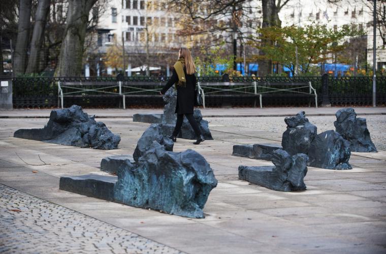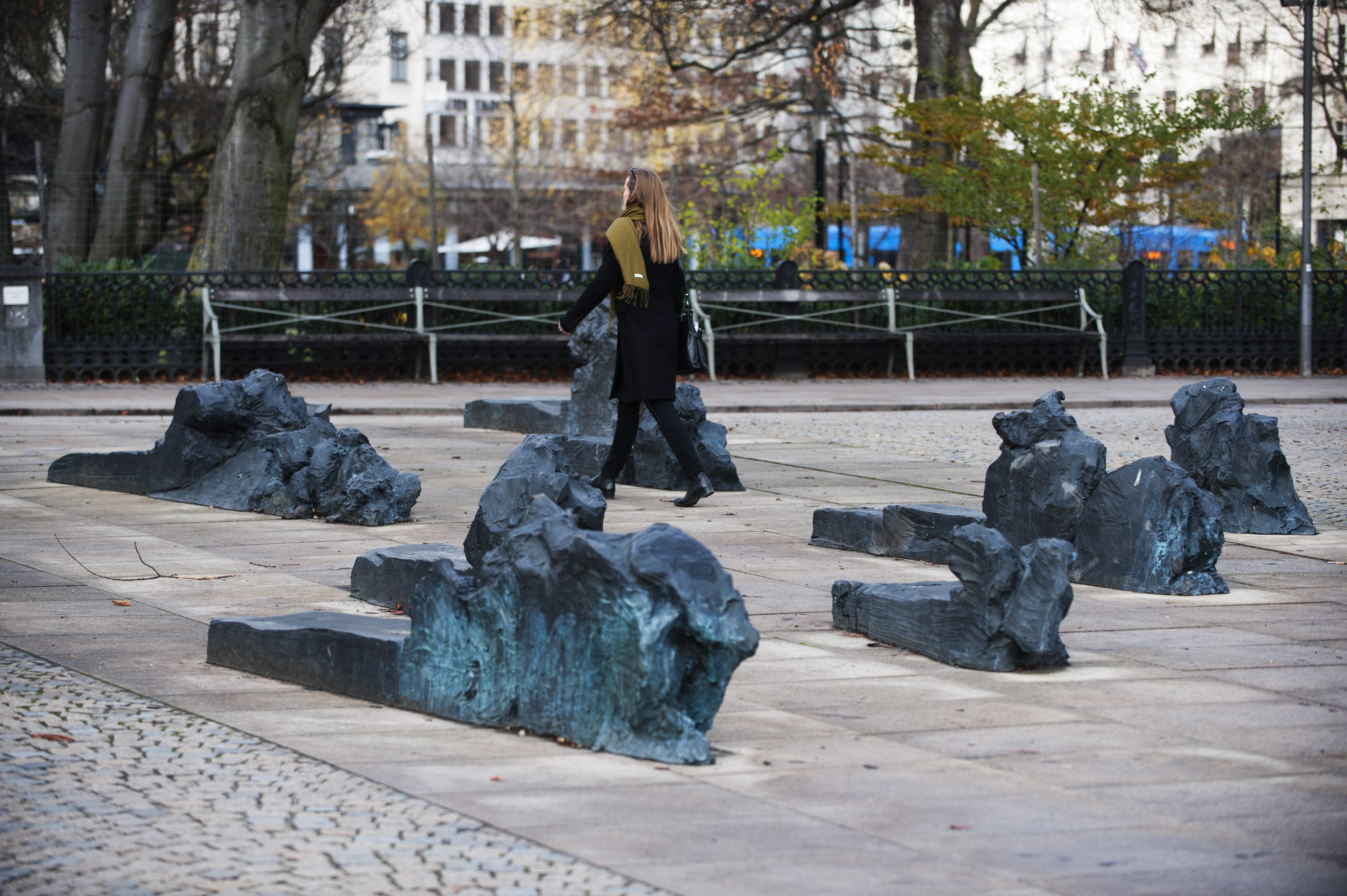 Kirsten Ortwed fostrades i 1960-talets avantgardism och med rötterna i minimalism och konceptkonst är hennes verk ofta nonfigurativa och saknar uppenbara symboliska eller ideologiska referenser. De tolv sfinxliknande skulpturerna i granit och brons är ett ganska ovanligt minnesmärke, i traditionell mening. Konstnären utgick nämligen från frågan: ”Hur beskriver man en så allvarlig och komplex situation utan att förfalla till sentimentalitet?”.