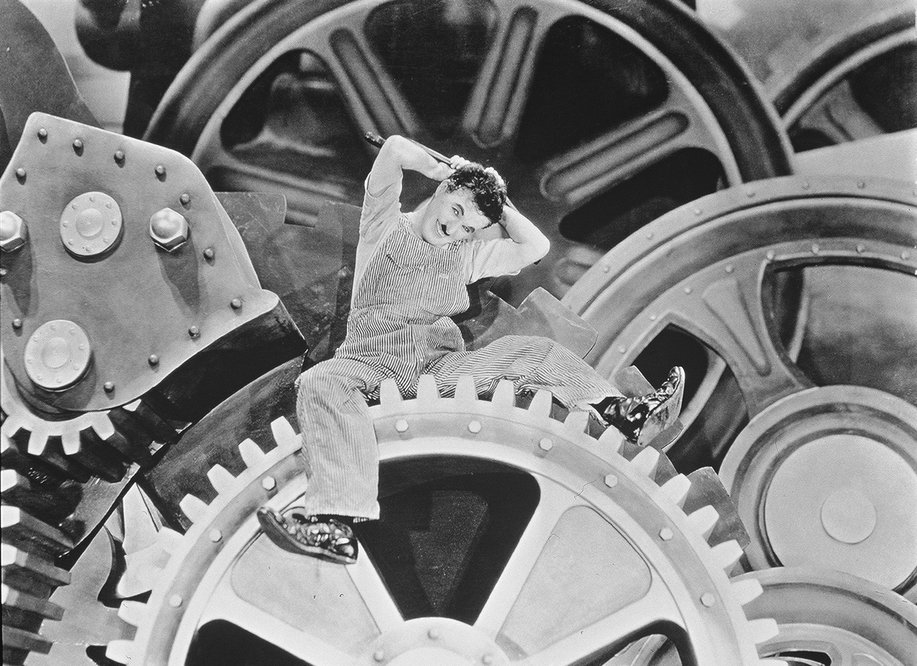 När man tittar på Moderna tider slås man förstås inte i första hand av udden riktad mot talfilm, utan uppgörelsen med orättvisor och fattigdom. Det är en social kommentar, där det allra värsta kanske inte är att vara hungerns fånge, utan det konformistiska samhällets. Här är urverket och de oljade dreven i fokus, ett maskineri där människans frihet är kringskuren så till den grad att man bokstavligen kan fastna mellan kugghjulen. Det är symptomatiskt att det är genom dans som Chaplin frigör sig från det löpande bandet. Detta leder honom raka vägen till sinnessjukhuset. Kultur och självförverkligande är subversivt i det avhumaniserade samhälle Chaplin skildrar. Visst handlar det om klasskillnader och social misär, men i slutändan är det största lidandet att fjättras i urverket. Hungern är inte tillräckligt stark för att kväsa själen. Anden vinner lite romantiserat över materien när den lille luffaren och hans följeslagerska vänder industristaden ryggen och tar till vägarna.