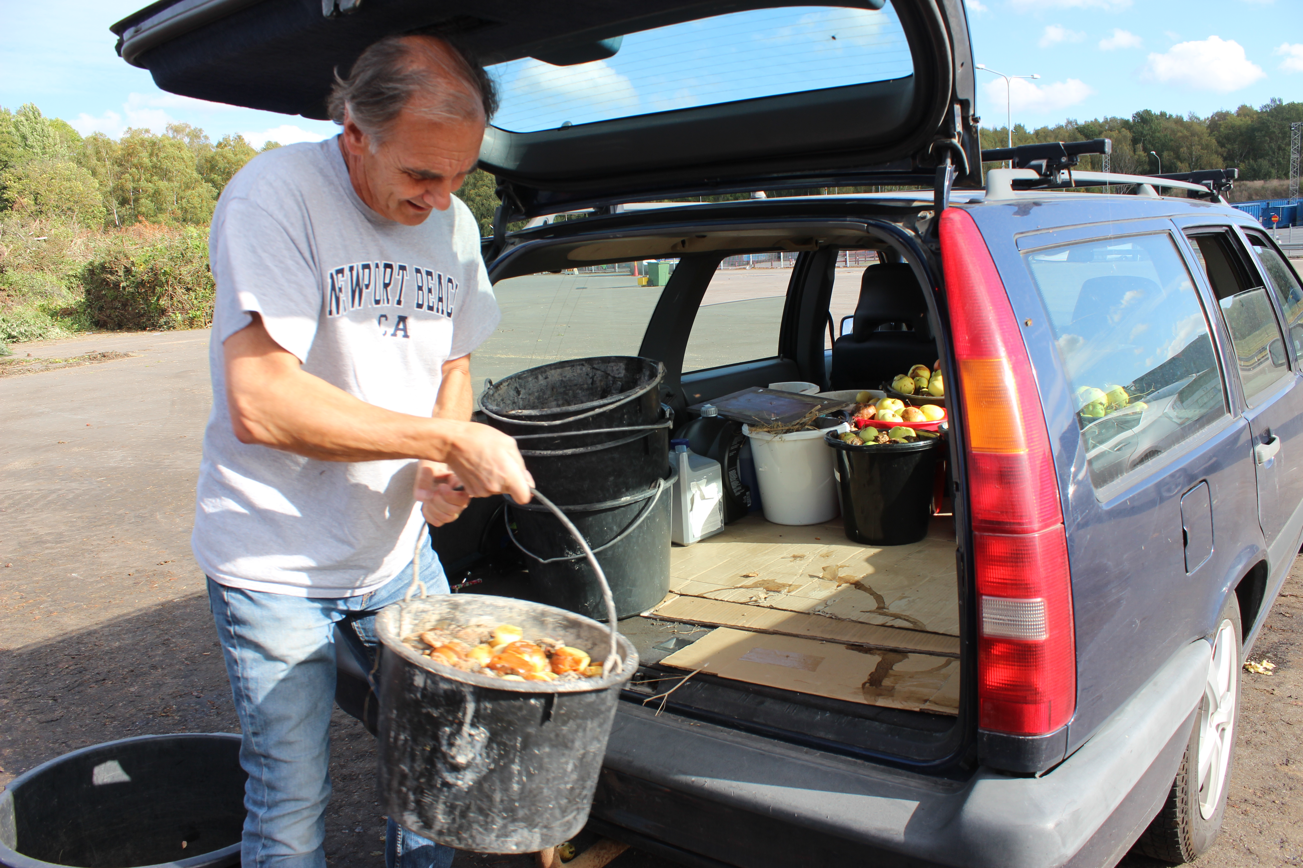 En av dem som har kommit förbi för att lämna frukt är Lars Peter Bjerudd. Han har hela bakluckan full med hinkar med äpplen och har varit tvungen att fälla baksätena på bilen för att få plats med ännu mer. Hemma i trädgården finns fem stora äppelträd som har stått där sedan 1930-talet, berättar han.