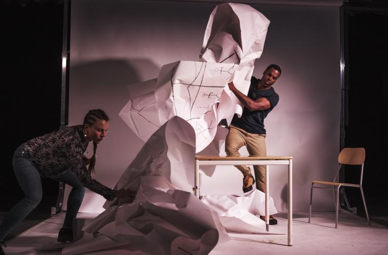 Johanna Mårtenssons scenografi förtjänar en särskild eloge. Fonden utgörs av en stor rulle vitt papper, som rullas ner och klipps av vid vissa scenbyten. Skådespelarna tecknar komiskt enkla skisser med ritkol av köksmöbler eller skogsmiljöer. Extra roligt blir det under svampturen där dottern hittar ”kantarellerna” i fonden och helt enkelt klipper ut bilden från pappret och lägger den i sin svampkorg. I ett annat minnesvärt ögonblick målar hon läpparna med röd whiteboardpenna, vilket möjligen kan tolkas som en kommentar kring gruvdriftens förgiftning av sina omgivningar.