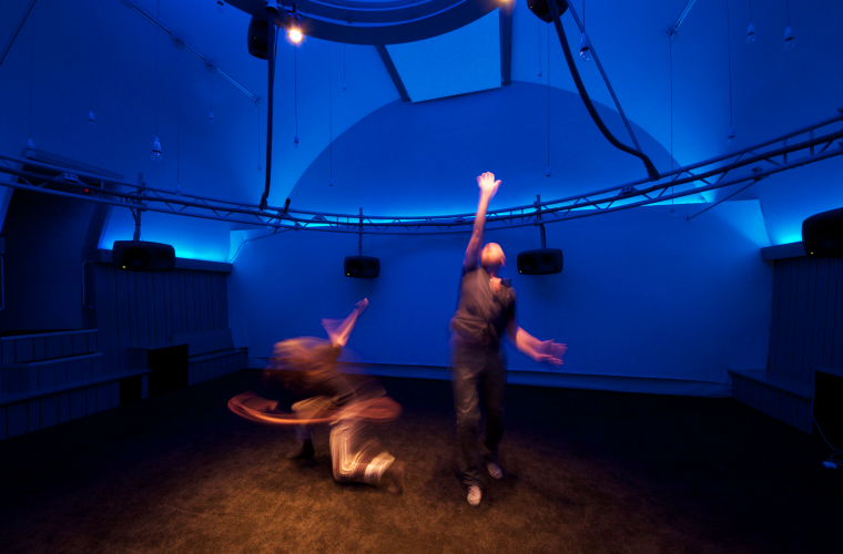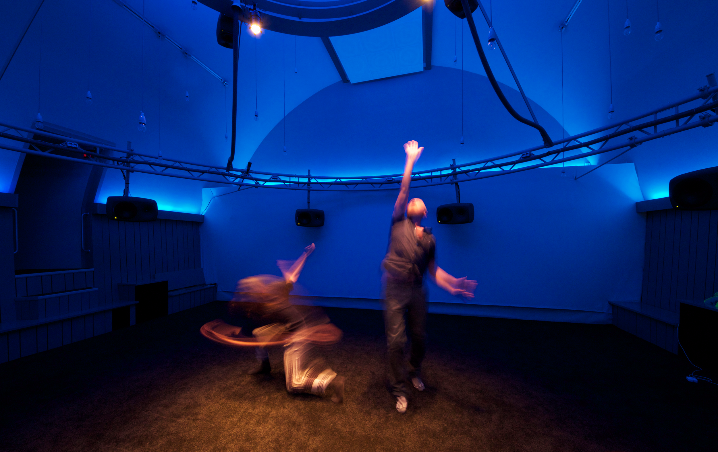 – Rummet är uppbyggt i modulär form, vilket gör att de tre delar som finns kan bytas ut vid behov, eller spridas ut på olika datorer. Exempelvis kan en tonsättare eller ljudkonstnär som har ett eget ljudsystem få data ur systemet och ta del av de rörelsebaserade delarna, säger Marcus Wrangö.