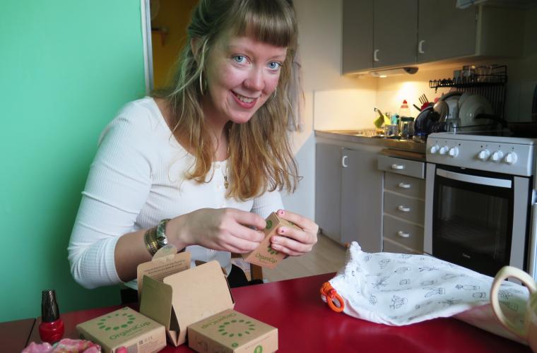 Malin Karlsson går och hämtar mobilen för att kolla det slutgiltiga beställningen – 23 095 kronor slutade insamlingen på. Det räckte till 155 menskoppar. Nu återstår jobbet med att ta ut varje liten tygpåse som menskopparna ligger i ur pappkartongerna för att minimera vikt och utrymme. Utan kartongen blir de små, väger nästan ingenting, och alla ska ner i de två halvpackade resväskorna som ligger på golvet i vardagsrummet.