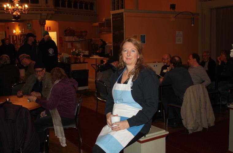 Sedan ett drygt år tillbaka är hon anställd av Stadsmissionen på S:t Johanneskyrkan i Masthugget. Denna onsdagskväll är det soppkök och fullsatt i lokalen. Gästerna är hemlösa, pensionärer och ”vanligt folk” som gillar gemenskapen och det oslagbart billiga priset, en tia för en skål soppa och bröd.