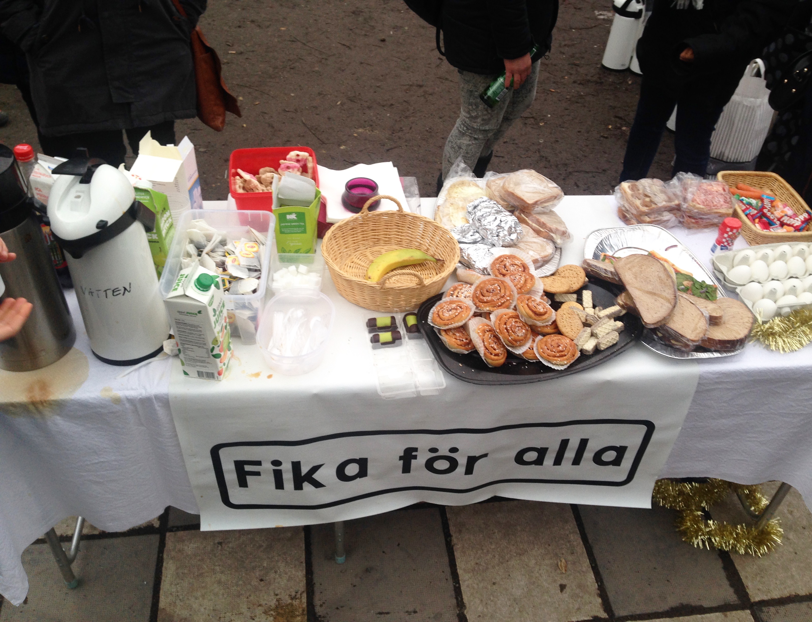 Varje lördag står volontärer vid Björns trädgård och delar ut kaffe, mackor och fikabröd till behövande. Vad som startade som en antirasistisk manifestation har nu blivit en tradition. På lördag 4 februari fyller Fika för alla ett år.