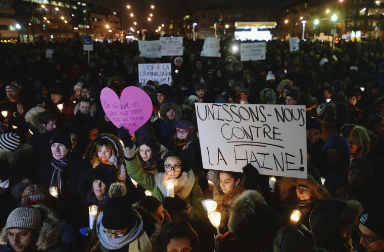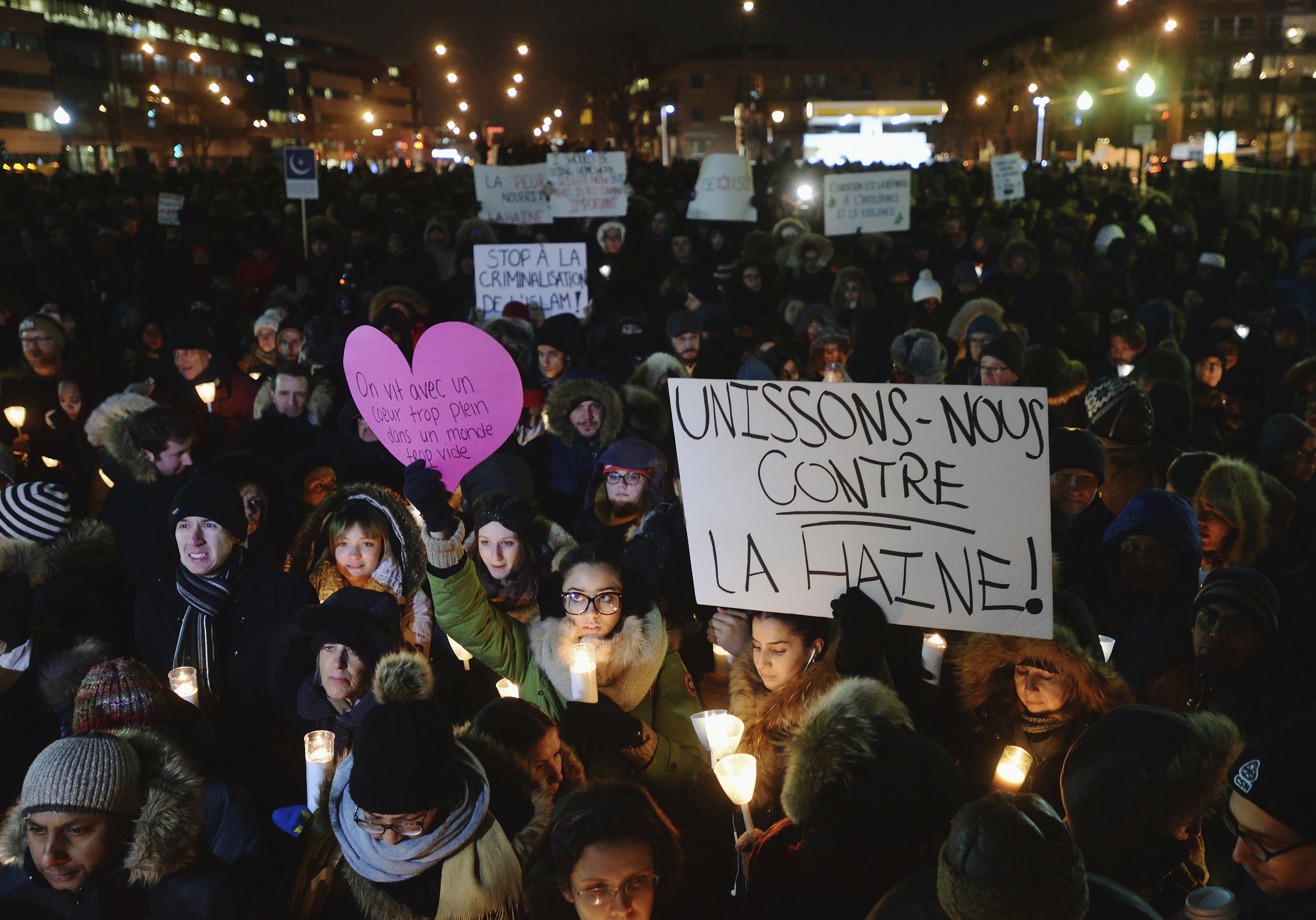 ”Vi får hoppas att en följd av detta blir ett förkastande av dem som sprider hat”, sa borgmästare Régis Labeaume till de tusentals Quebec-bor som samlats för en ljusmanifestation för terrordådets offer på måndagskvällen.