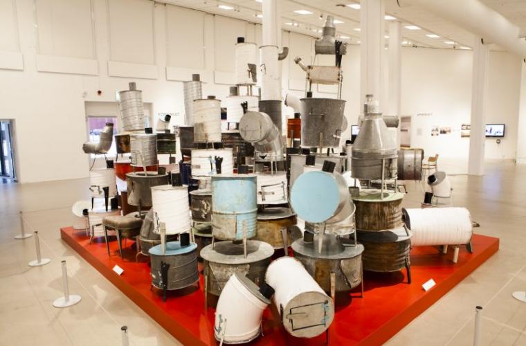 Korvkiosken delar golvutrymme med plåtkaminer i olika storlekar. De är lite skeva här och där, liksom mänskliga, med fläckvis klarröda, vitlackerade och turkosa detaljer som lyser mot det murrigt rostbruna. En har ett stort hjärta till lucka, en är ett litet ufo. De är tillverkade av oljetunnor och expansionskärl, ventilationsrör och allt möjligt vackert gammalt järnskrot. På väggen bakom hänger fotografier med kaminerna i utomhusmiljö. De har titlar som Nyss eldade kaminer i grupp och Kamin som Star Wars figur. I projektet Antons skrotkaminer för utomhusbruk har Johannes Samuelsson dokumenterat den romska plåtslagaren Anton Ciurar och hans son Anton Clopotar, som tillsammans byggt skrotkaminerna.