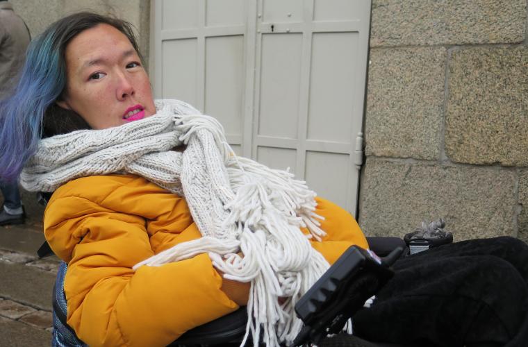 Sofia Jönsson från DHR visar sin bil som står parkerad precis utanför Rådhuset vid Gustaf Adolfs torg. Trots att det är en parkeringsplats markerad med en rullstol fick hon ta sig framåt på bilvägen – trottoaren kom hon inte upp på för att kanten är för hög.