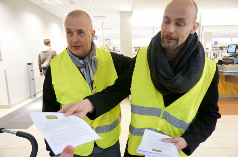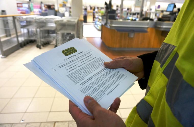 – Vi upplever att Systembolagets personal har hamnat i det man kallar prekariat. Vi hoppas att kollegor ser att de inte är ensamma i den här svåra situationen och att allmänheten får upp ögonen för personalens villkor, säger Emil Boss, som under tisdagsförmiddagen delar ut flygblad utanför sin arbetsplats.