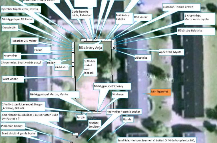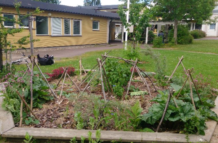 Det började med att han satte ner några vinbärsbuskar vid lekplatsen. Buskarna dog men de skapade en stor nyfikenhet bland barnen i området, så han fick ny energi att fortsätta. Nu står träd och buskar utspridda på gårdsplanen. Många av växterna är planterade intill staketet på utsidan runt en stor lekpark. I en sandlåda, som hyresvärden skulle göra om till gräsmatta, odlas ängsväxter, vårlökar, rabarber, citrontimjan och havtorn som om sommaren lockar till sig steklar, larver och bin.