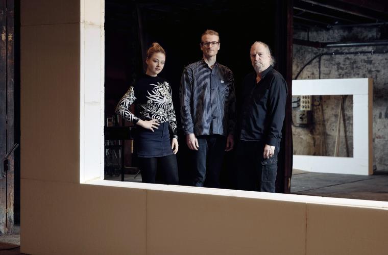 • Regissören Erik Holmström flankerad av Maja Kall, scenograf och Dror Feiler, tonsättare.