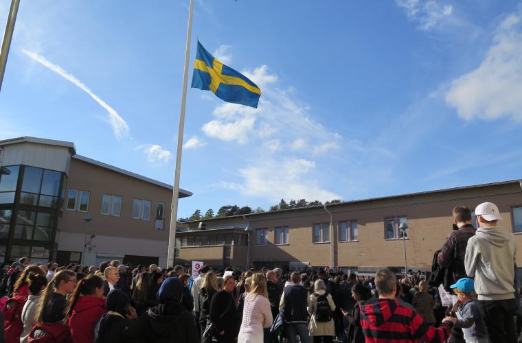 På plats var bland andra utbildningsminister Gustav Fridolin, och många medlemmar från Lärarförbundet. På Lövgärdesskolans skolgård vajade flaggan på halv stång när människor delade med sig av sin sorg över det som hänt. Budskapet som stod skrivet på skyltar runt om i tåget upprepades; Lägg ner ditt vapen.