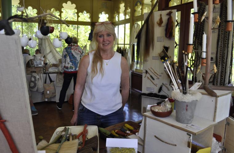 Hon säljer själv bland annat borstar och brickvävda armband av tagel. Ofta är det kombinerat med hennes andra favoritmaterial att slöjda i, som är pinnar. Av dem skapar hon pennor, brödpickare, ljusstakar och andra bruks- och prydnadsföremål.
