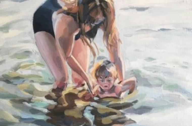 Hold on kallar konstnärinnan sin utställning bestående av 36 utsökta målningar med referenser till hennes föräldrar, vatten och landskap. När jag kom till galleriet fick jag ett snabbt tycke för helheten, bortom motivet i ett figurativt konstnärskap som sätter människan i fokus. Britt-Marie Kühlhorn är en intuitiv och begåvad stafflimålare som arbetar i mindre format men lyckas få en att uppleva både frihet och glädje så att formatet bildligt spricker i personliga associationer och känslor. I spontana penseldrag och vågade kontraster, leder konstnärinnan oss i tankar kring hur den stora mästaren Zorn arbetade med samspelet mellan ljus och skugga. En gedigen förtrogenhet med teckning gör att Britt-Marie Kühlhorn knappt tecknar sina kompositioner med kol eller liknande utan skapar direkt med penseldraget och färgfält. Den anekdotiska idyllen om ett bra liv i målningar som Moderskap och Lyssnar blir en diptyk i mina ögon – finner jag en strävan efter en balans i samtiden, när vi kan drabbas av otäcka händelser såsom attacker och militära manöver.