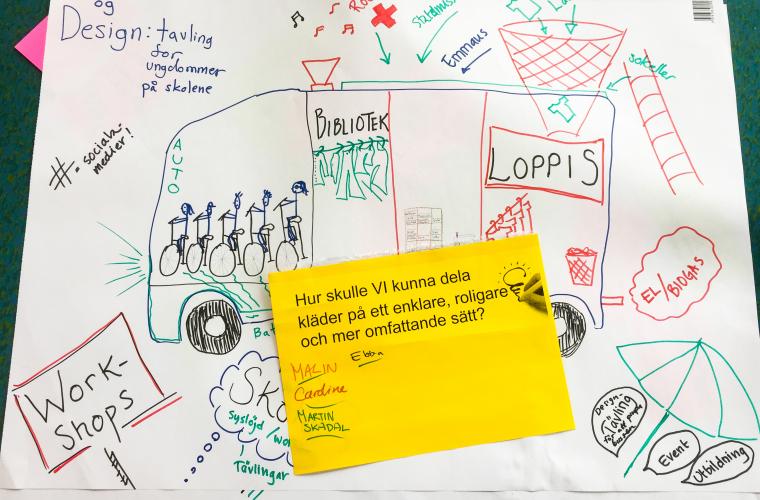Klädbytarbuss. Ett mobilt klädbibliotek, lagningscenter och loppis, en buss som även erbjuder kurser och information kring återbruk till skolor.