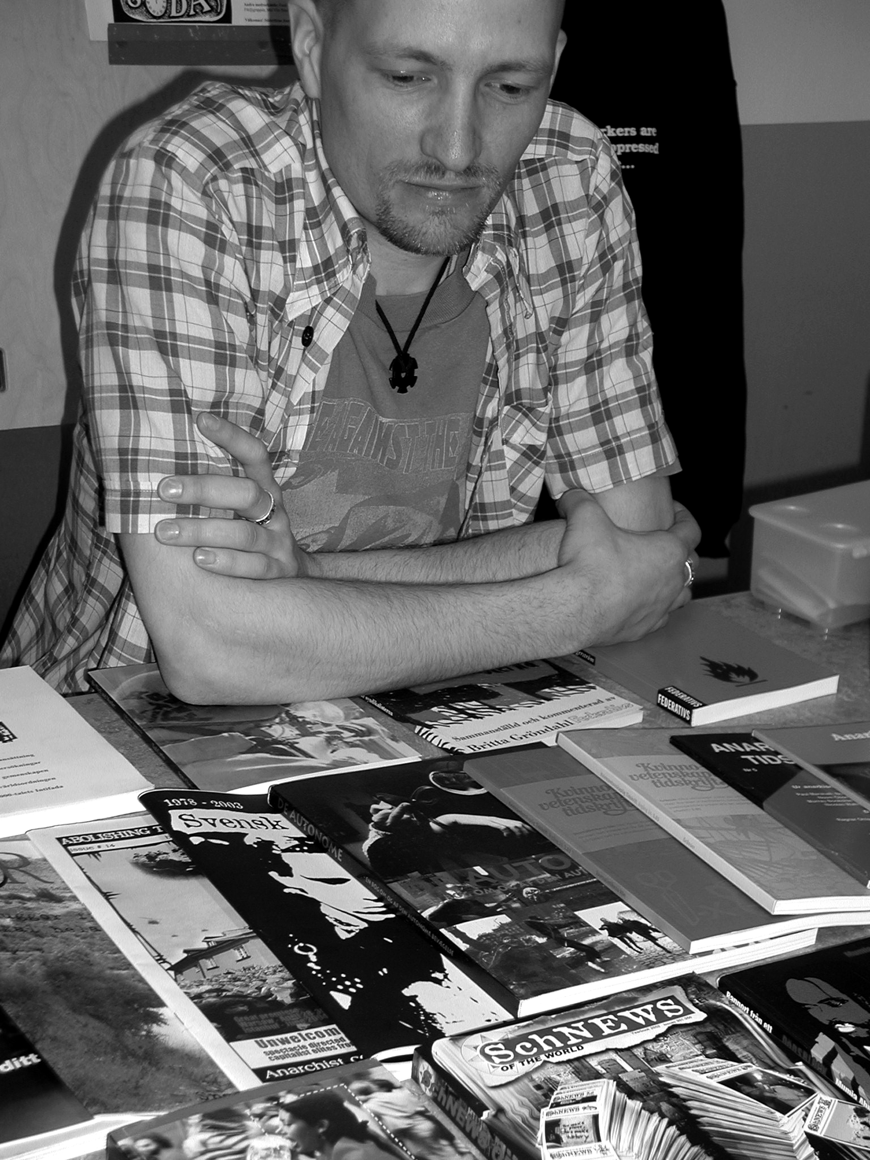 I onsdags anordnades Framtidsdagarna på Södertörns Högskola i Flemingsberg. En mängd olika företag och organisationer hade bjudits in till skolan för att studenterna skulle kunna knyta kontakter, och företagen locka framtida anställda. Samtidigt i lokalen bredvid höll Södertörns anarkistiska samanslutning en alternativ framtidsdag. Fredrik Sjögren är en av organisatörerna.