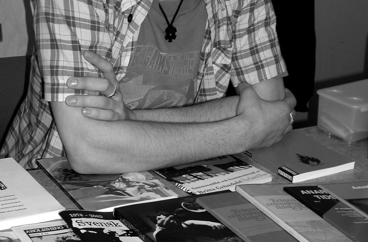 • Peter från Bokhandeln Info säljer böcker på den alternativa framtidsdagen på Södertörns högskola.