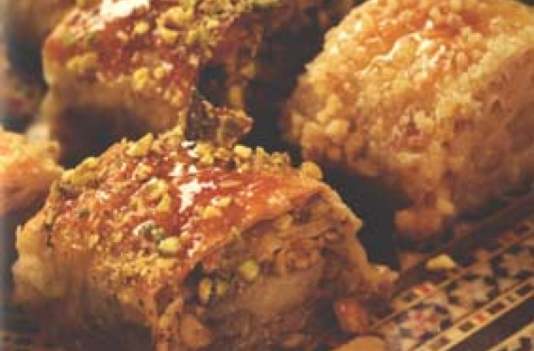 Krossa nötterna i en mortel, eller hacka dem fint. Blanda nötter, socker och apelsinblomsvatten. Lägg två ark filodeg på varandra och pensla ovansidan med smält smör. Sprid ut nötfyllningen på filodegen och rulla ihop försiktigt. Skär rullen i 3 centimeter tjocka skivor som läggs i en smord form. Pensla ovansidorna med smör. Täck över formen med aluminiumfolie och grädda i 150 graders ugnsvärme i cirka 10 minuter. Ta av folien och grädda ytterligare 5 minuter tills baklavan blivit gyllengul.