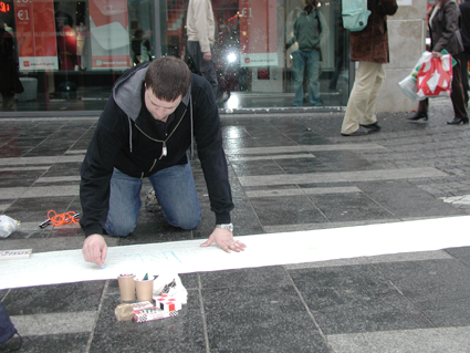 Micael Friberg är en av de förbipasserandena som stannar och deltar i konstverket.